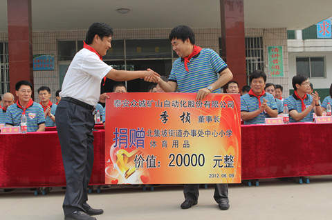 儀式上,長(zhǎng)江商學(xué)院EMBA十九期28名學(xué)員為北集坡中心小學(xué)捐贈(zèng)了“手拉手紅領(lǐng)巾書屋”,其中圖書2000冊(cè)、電腦10臺(tái);學(xué)員代表、眾誠(chéng)礦山股份公司董事長(zhǎng)季楨捐贈(zèng)了價(jià)值兩萬元的體育器械。
