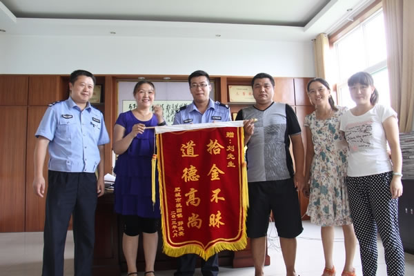 失主尋找了多個交警大隊,終于在開發(fā)區(qū)大隊尋找到拾金不昧的協(xié)警劉衛(wèi)彬,當面向劉衛(wèi)彬表示了感謝,并立即送上錦旗,贊揚劉衛(wèi)彬“拾金不昧,道德高尚”。